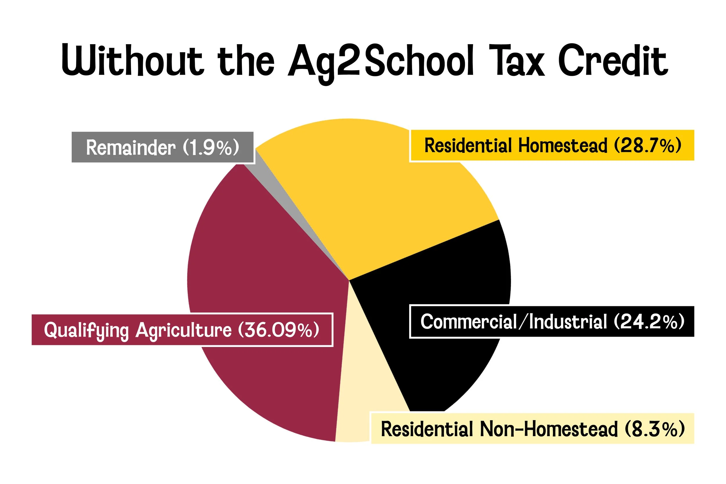 The State of Minnesota’s Ag2School Tax Credit reduces the contribution percentage for agricultural landowners to 30%. If approved, approximately 26% of the total bond referendum’s principal and interest will be covered by the state’s 70% tax credit.
