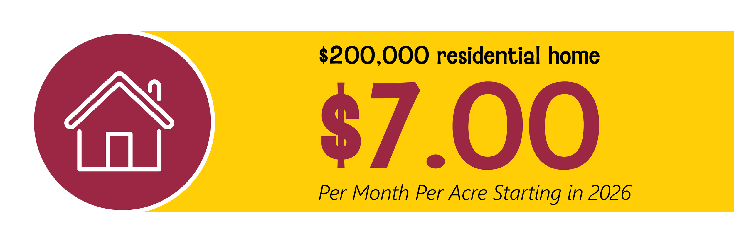 Your individual tax impact will depend on the value of the property you own. For a $200,000 residential home in the district, the estimated tax impact is approximately $7 per month starting in 2026. For an agricultural homestead with an estimated market value of $10,000 per acre, the estimated tax impact would be $0.06 per acre per month ($0.75 per acre per year) starting in 2026.