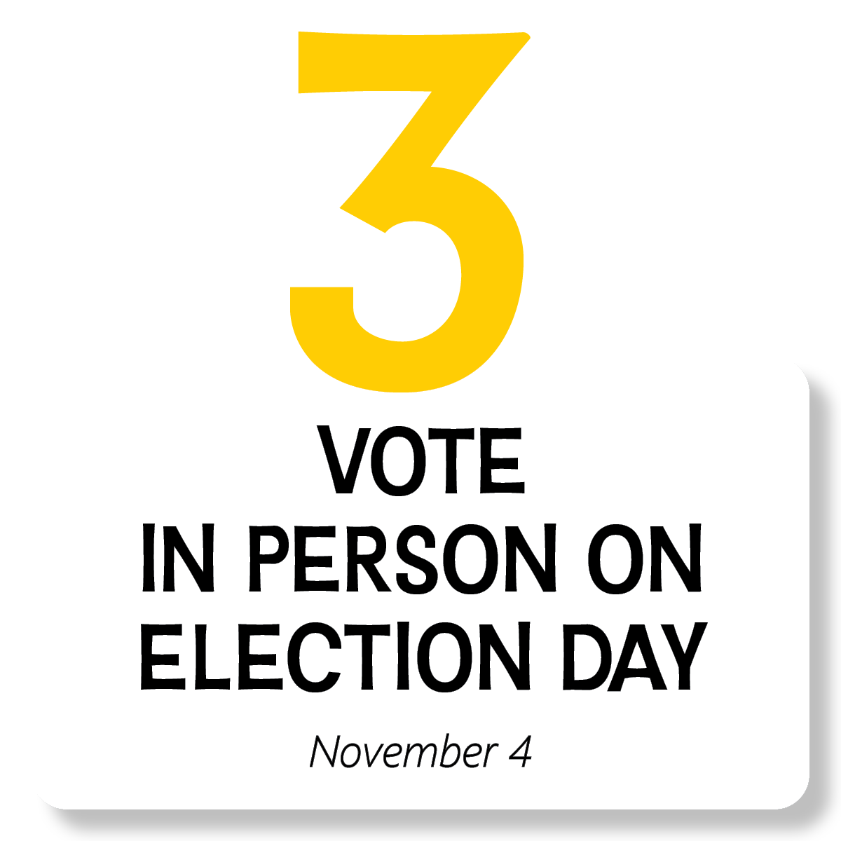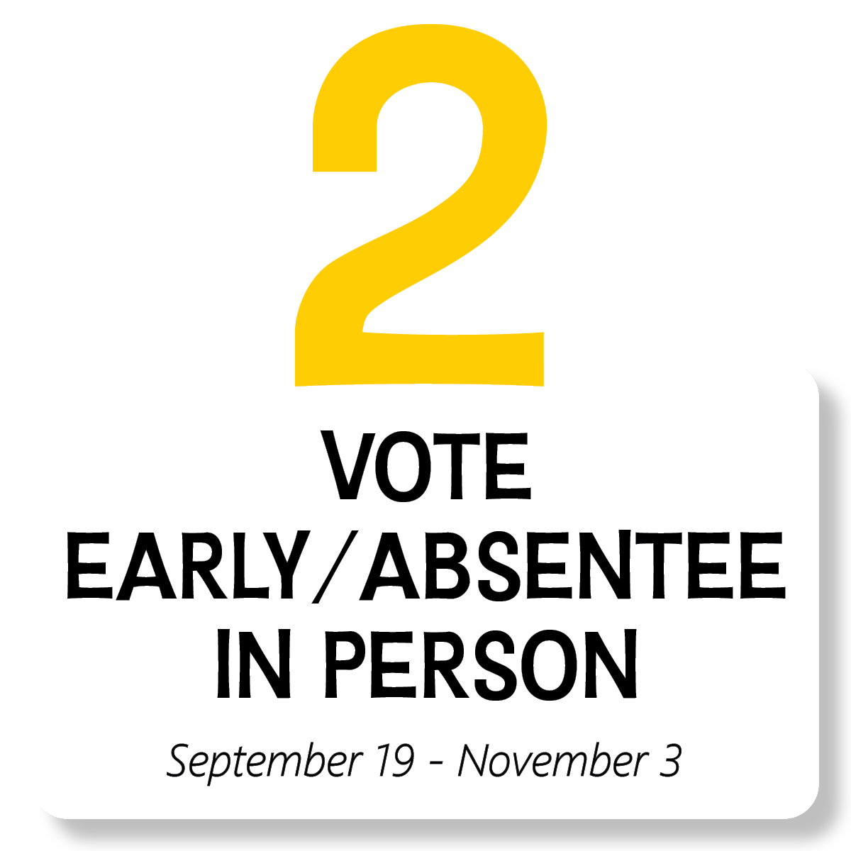 Election Day is Tuesday, November 4, and early/absentee voting is available starting on Friday, September 19, through Monday, November 3. There are three ways to vote on or before Election Day.
